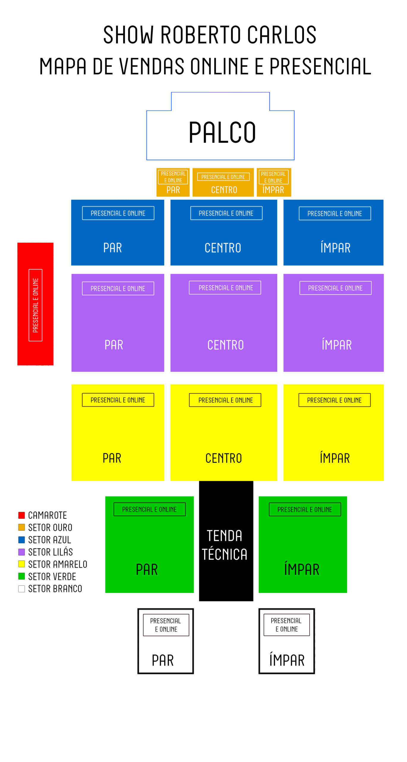 O público assistirá ao espetáculo em cadeiras, espalhadas pelo campo de futebol. Serão divididas em setores: ouro, azul, lilás, amarelo, verde e branco, sendo o setor ouro o mais próximo do palco e o setor branco o mais distante. Não haverá cobertura.